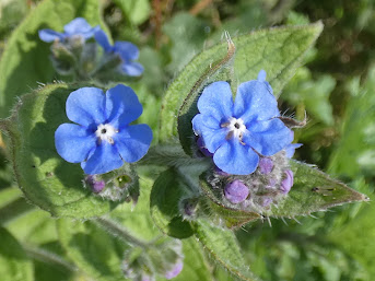 This flower has such lovely deep blue petals one wonders why it is called green alkanet, after all nearly all flowers have green leaves and stems because they contain chlorophyll. The answer would appear to be that this plant retains its green leaves and stems throughout the winter, it is always green even when there are no blue flowers.